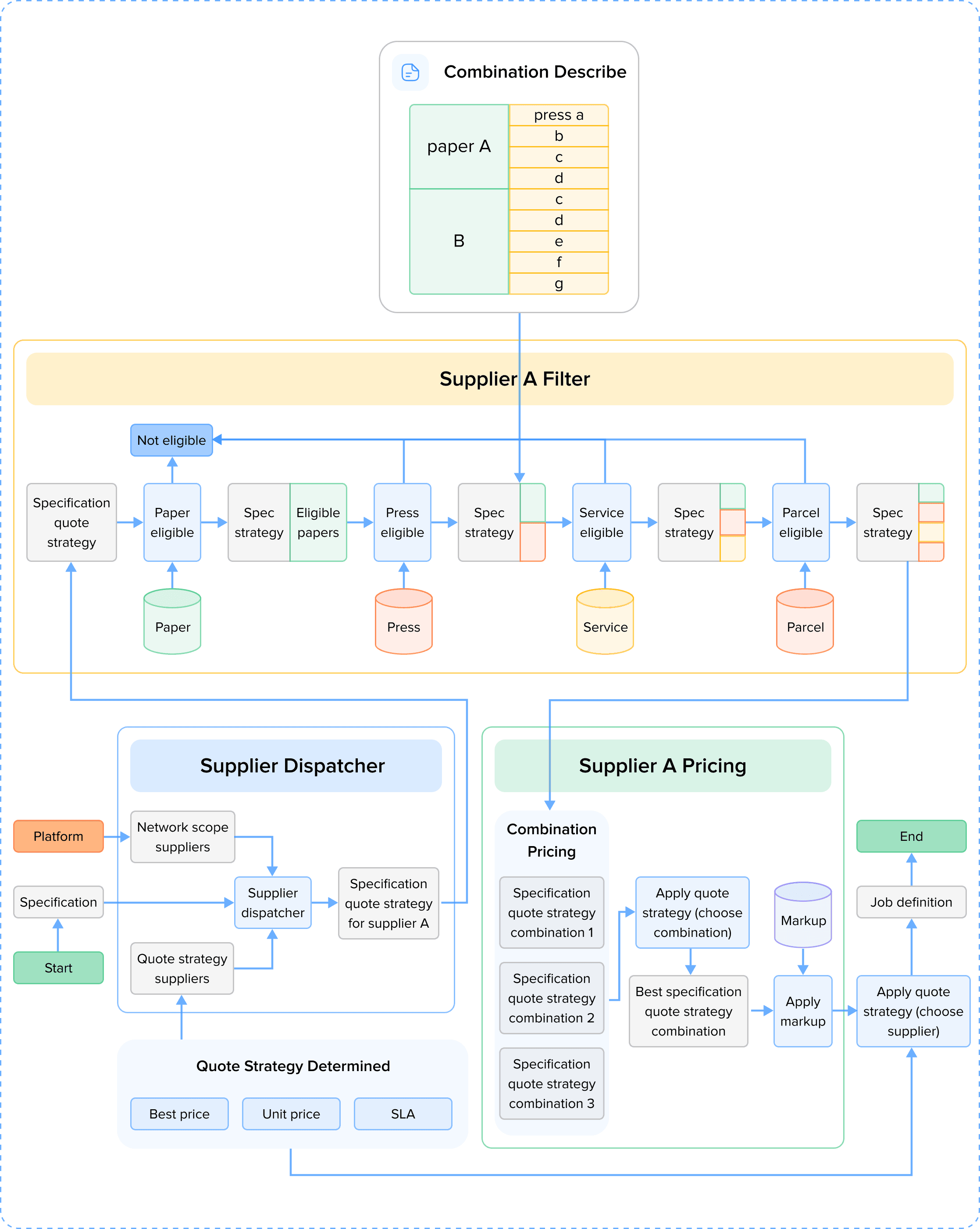 An organization could work with many suppliers. We needed to allow an organization to include the data of multiple suppliers in the pricing engine calculations so the system could select the best supplier to produce a print job within its network.