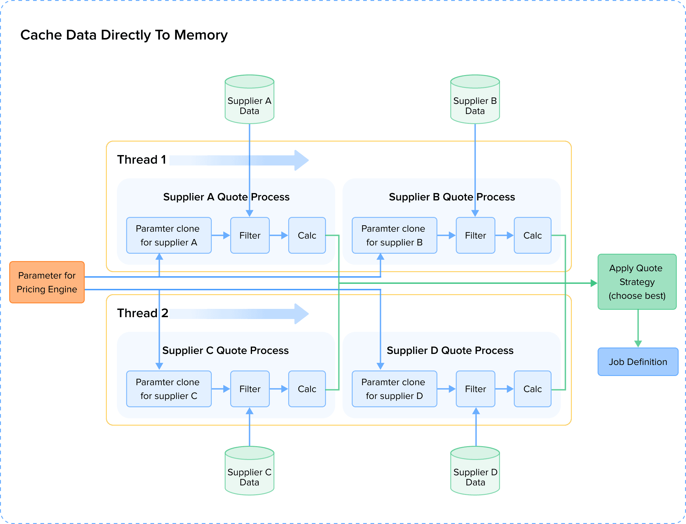 Since we used the same algorithms across the system to generate a price, we realized we could clone the algorithms, print specifications, and quote strategy elements and simultaneously compute prices for all suppliers in a network using cache data with multithreading. To reduce latency, we automated CPU resource allocation to increase or decrease depending on the number of suppliers or transactions occurring concurrently. Further, supplier data could be used repeatedly without reallocating memory.