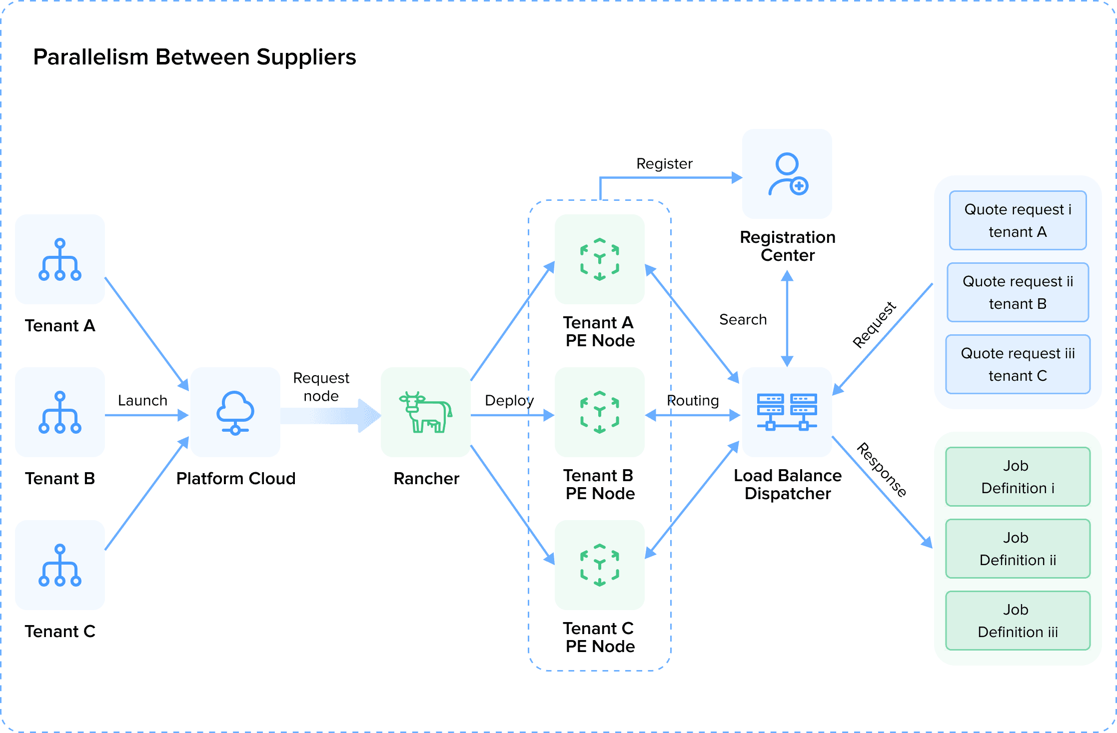 Each supplier maintains its data stored on the platform. With tenant-level data isolation, the individual tenant nodes only need the data of the supplier network. This dramatically reduces the data scope of each node, allowing for horizontal scalability and significantly improved performance and resource utilization.