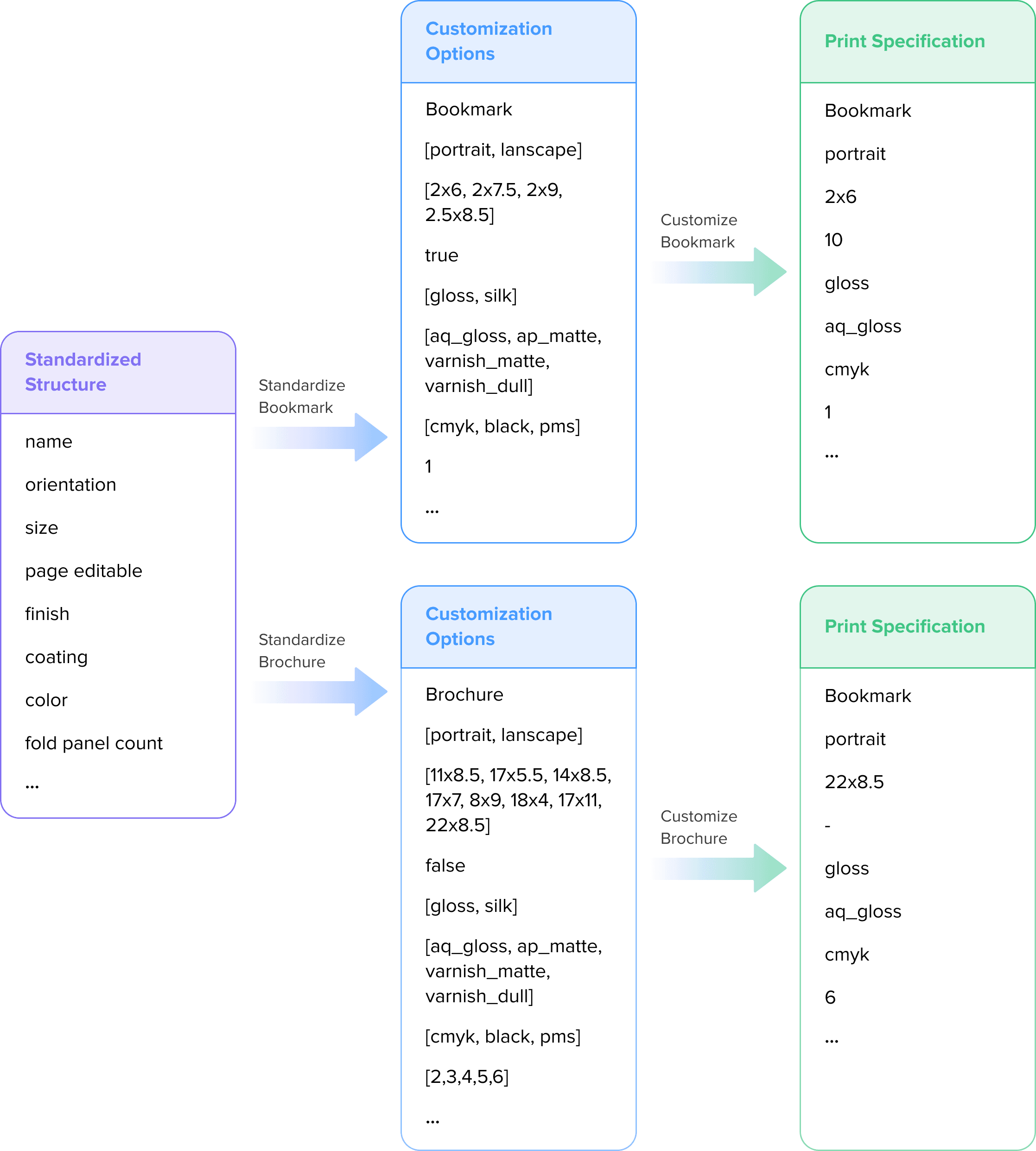 As you've read earlier, a standardized set of attributes using the SKU system was established to calculate and compare print job prices in real-time. A buyer could choose what was needed for the print job, and a supplier could determine what is offered in SKU management. However, after a buyer determines what they want, the system generates a print specification describing the finished product and uses that to get a price from all suppliers in the system.
