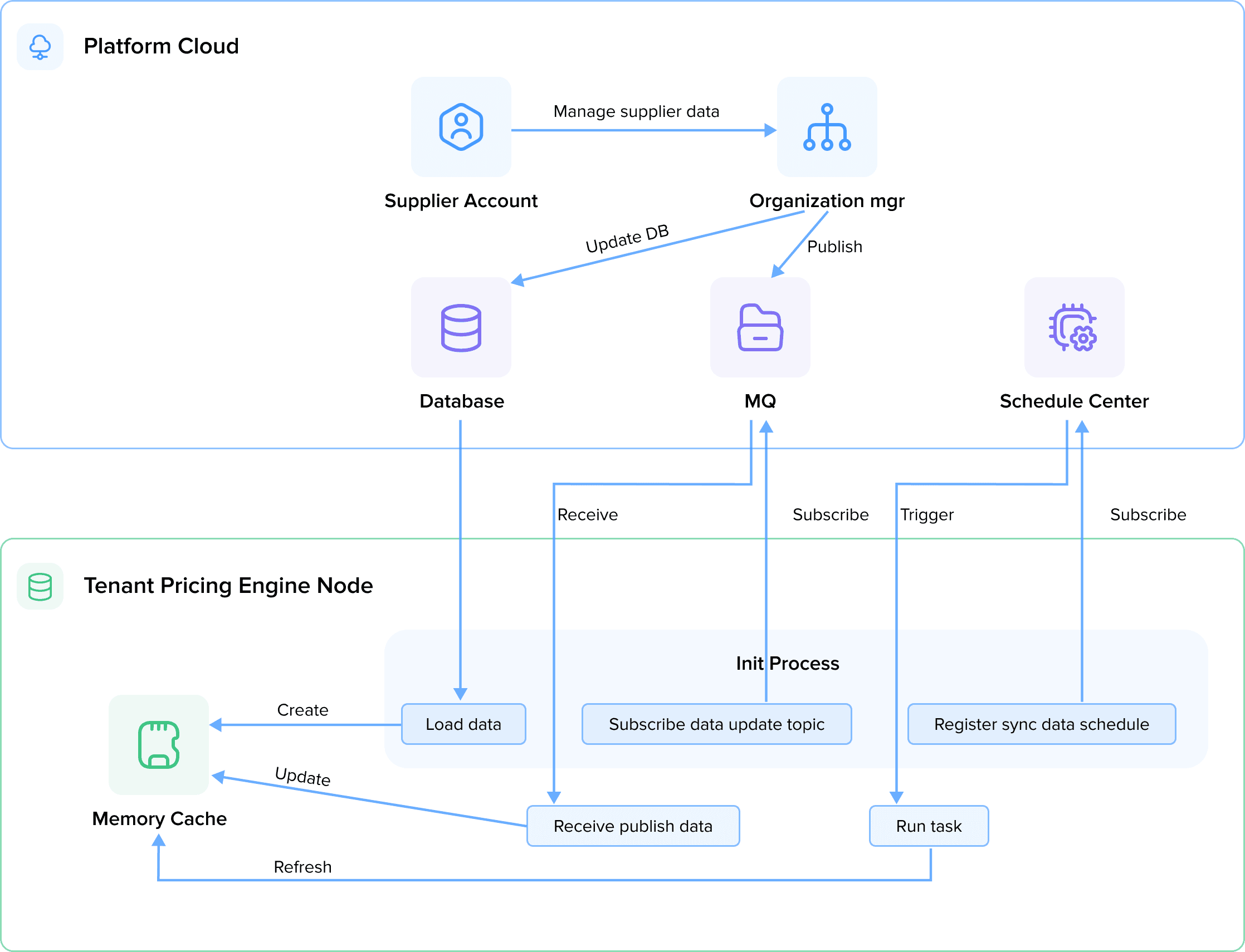 The best solution was to cache data to memory rather than use database calls for each pricing update. Since tenant-level data isolation greatly reduced the amount of data required by a node, the memory capacity in the cache could easily accommodate the data needs of a supplier network.